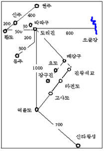 『신당서』 지리지 하북도에 따르면, 득물도에서 압록수 입구까지 1,000리이며, 득물도에서 남동쪽으로 700리 거리에 신라 왕경이 있었다고 기록되어 있다.