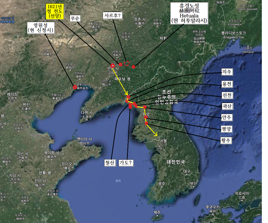 [그림 1] 사르후 전투 추정지역과 정묘호란 침입경로