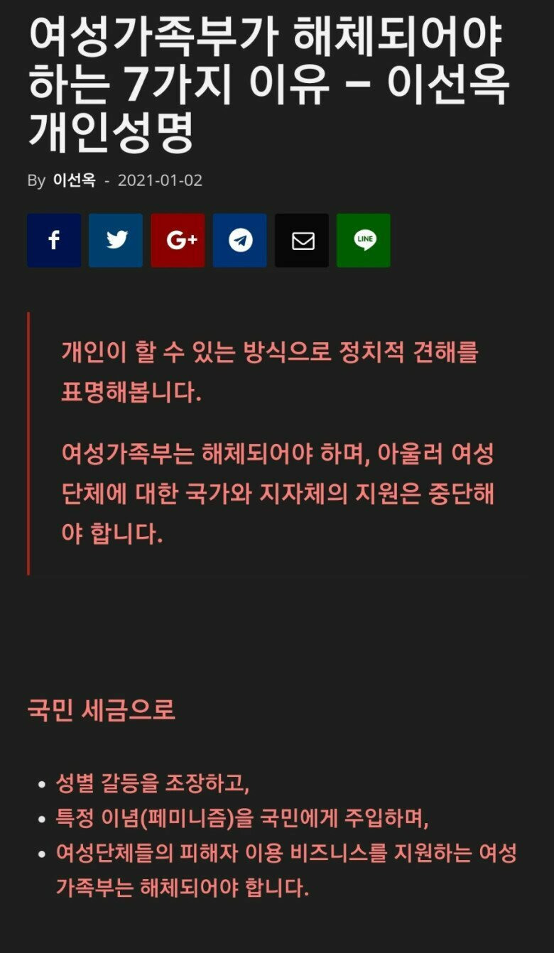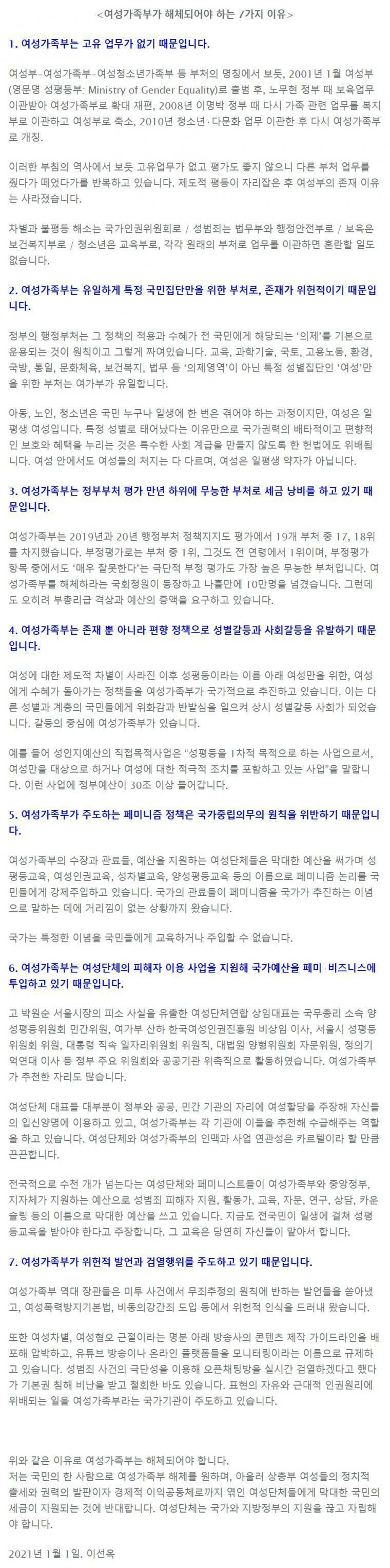 여성가족부가 해체되어야 하는 7가지 이유 작성자이연|작성시간25.09.22|조회수7 목록 댓글 0 글자크기 작게가 글자크기 크게가 다음검색 현재 게시글 추가 기능 열기 북마크 공유하기 신고 센터로 신고 댓글 댓글 0 댓글쓰기 답글쓰기 댓글 리스트