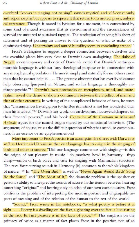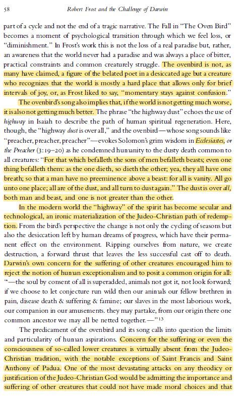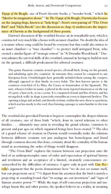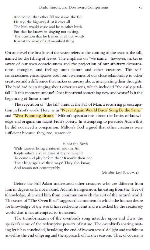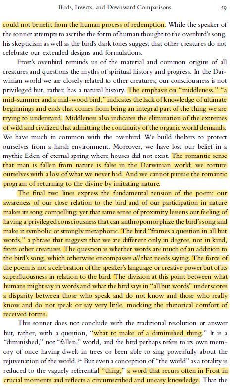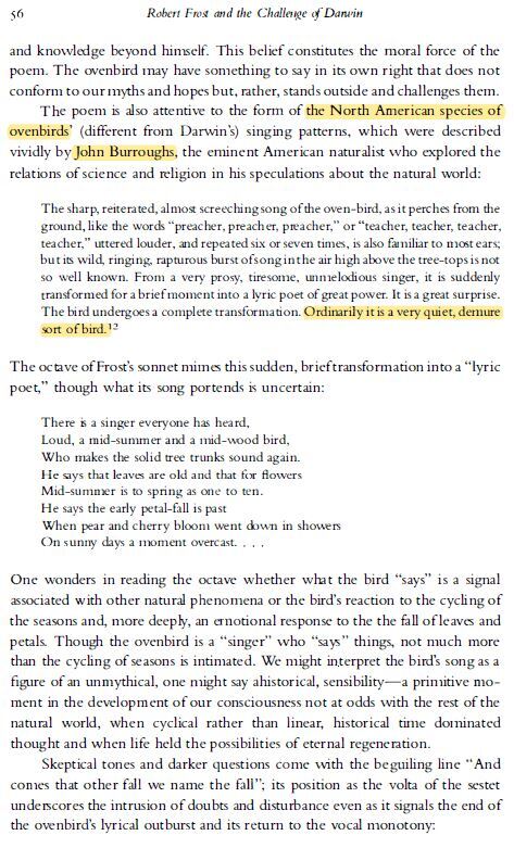 For his own purposes Frost chose the ovenbird whose song is pedagogical, not lyrical. He reverses Torrey's emphasis, which was on the lyrical beauty of the afternoon song. Surely Torrey's view of the ovenbird was too conventional for Frost's more insistent taste and therefore wholly unsuited to the specific purposes of his parablelike poem. In Frost there is, of course, no indication that the ovenbird sings a beautiful flight song as well as the dry, sharp, rasping song for which it is better known. The existence of its melodious flight song is a fact not at all useful to the poet answering the sentimentalist whose song falters and fails before natural loss.