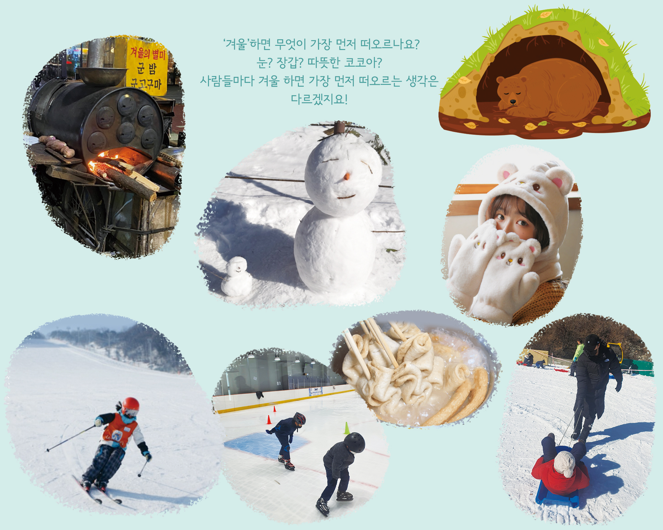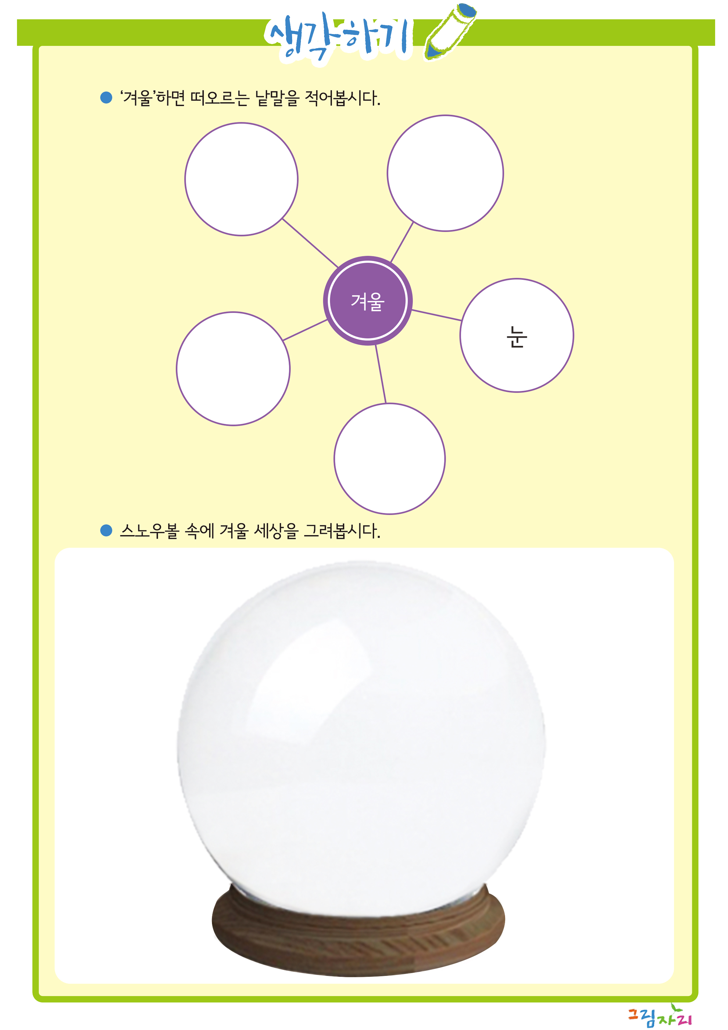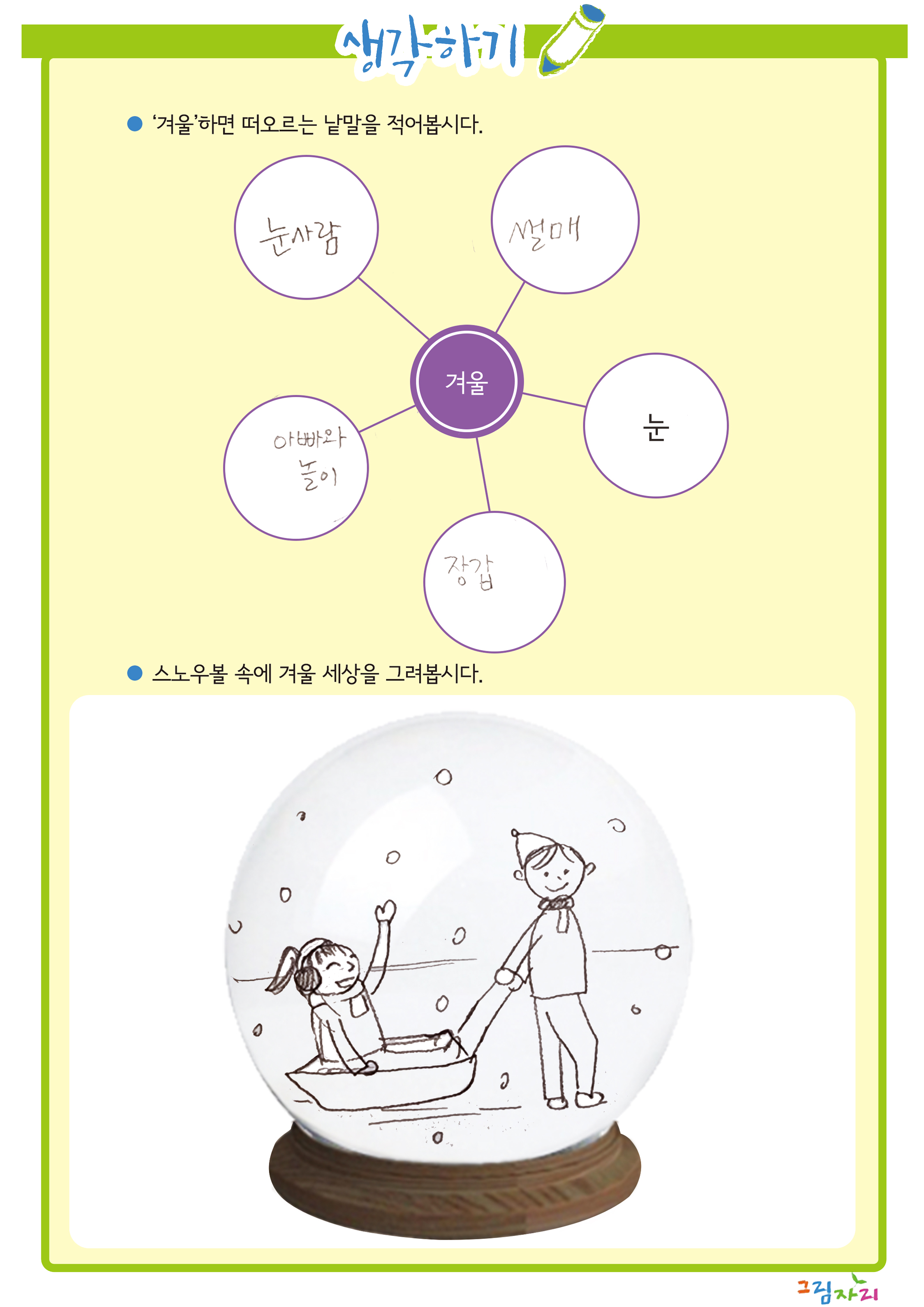 | 학습목표 | 겨울이 되어 달라진 주변의 모습을 관찰하고 겨울 풍경을 스노우볼에 담아 그릴 수 있다. |