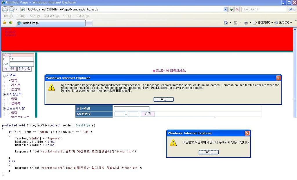 작성자김원기 작성시간 10.09.15 ScriptManager.RegisterStartupScript(this.Page, this.GetType(), "message", "alert(\"비밀번호가 일치하지 않거나 등록되지 않은 ID 입니다.\");", true);