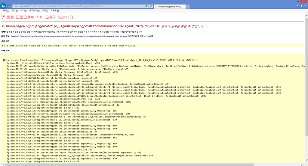 1 2 3 4 5 6 7 8 9 10 11 12 13 14 15 16 | public ActionResult DoExcel(string saupname, string branchname, string agentname) { StringWriter sw = new StringWriter(); // 가상경로 취득 string virturePath2 = Request.ServerVariables["script_name"]; Response.Clear(); string filename = "Agent_" + System.DateTime.Now.ToString("yyyy_MM_dd") + ".xls"; Response.ContentType = "application/vnd.xls"; Response.AddHeader("content-disposition", "attachment;filename=" + filename); Response.Write(sw.ToString()); return Json(new {file = filename, virtualPath =virturePath2}); } | cs |
