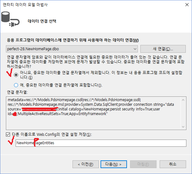 그래서 다시 EF 모델을 삭제하고 중요한 데이터를 연결 문자열에서 제외했었습니다.