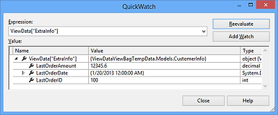 ViewBag 객체에 CustomerInfo 객체를 저장하였으며, ExtraInfo 라는 속성을 명시하였고, 이제 내부 값을 확인하기 위해 QuickWatch 윈도우에서 ViewData 객체를 살펴보죠.