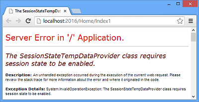 TempData 값은 실질적으로 ASP.NET Session 에 저장되며, 자동적으로 읽은 다음에 삭제됩니다. 실제로 세션에 저장되어있는 것을 증명하기 위해, web.config 에 아래와 같이 추가하여 전체 세션 상태를 해제합니다