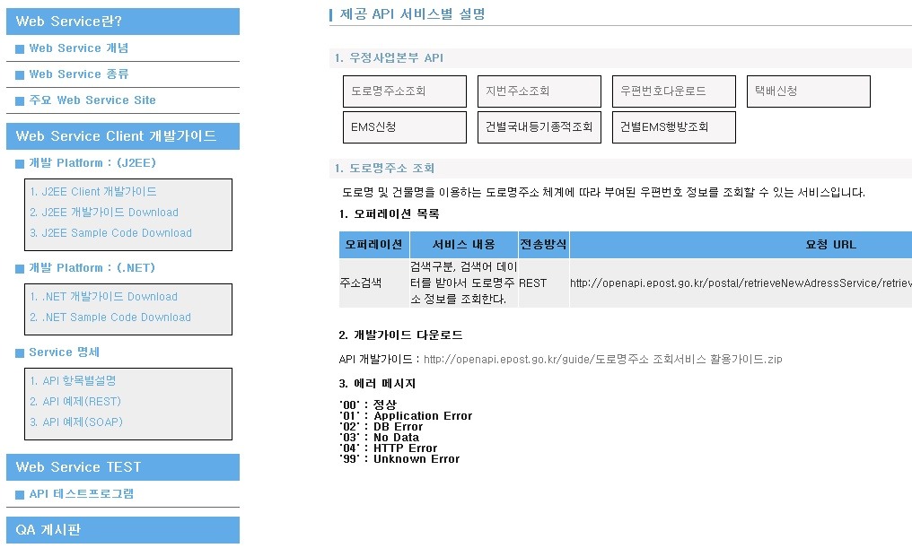 도로명 및 건물명을 이용하는 도로명주소 체계에 따라 부여된 우편번호 정보를 조회할 수 있는 서비스입니다.