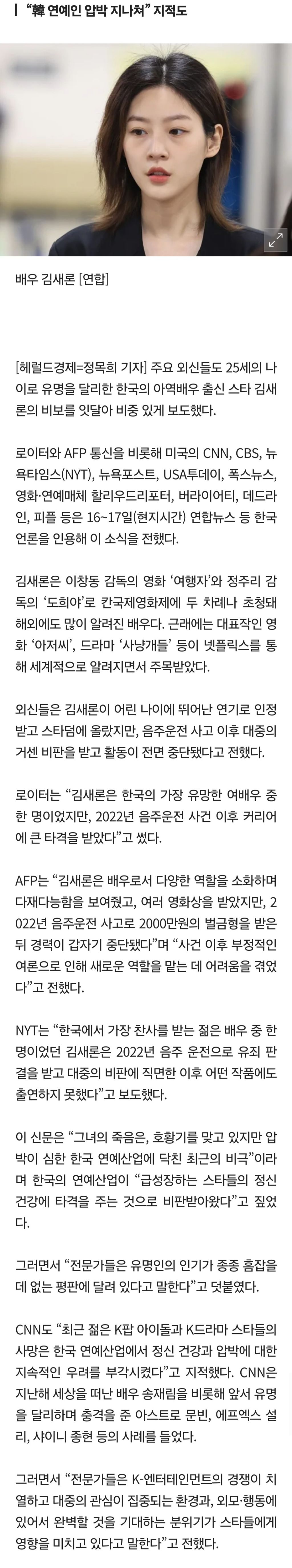 '김새론 비보' 외신도 주목…"외모·행동에 완벽 기대하는 분위기가 韓 스타들에 영향" 작성자무명이.|작성시간25.02.18|조회수404 목록 댓글 1 글자크기 작게가 글자크기 크게가 https://m.news.nate.com/view/20250218n03119'김새론 비보' 외신도 주목…"외모·행동에 완벽 기대하는 분위기가 韓 스타들에 영향" : 네이트 한눈에 보는 오늘 : 세계 - 뉴스 : 배우 김새론 [연합] [헤럴드경제=정목희 기자] 주요 외신들도 25세의 나이로 유명을 달리한 한국의 아역배우 출신 스타 김새론의 비보를 잇달아 비중 있게 보도m.news.nate.com 다음검색 현재 게시글 추가 기능 열기 북마크 공유하기 신고 센터로 신고 댓글 댓글 1 댓글쓰기 답글쓰기 댓글 리스트 작성자무명이. 작성자 본인 여부 작성자 | 작성시간 25.02.18 (25.02.18 기사)정치인에게 매우 엄격하고, 연예인에게 좀 더 관대한 한국 사회가 되길 바랍니다. 누구에게나 '두 번째 기회'는 필요하고 소중합니다. 댓글 전체보기
