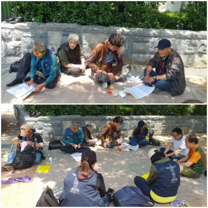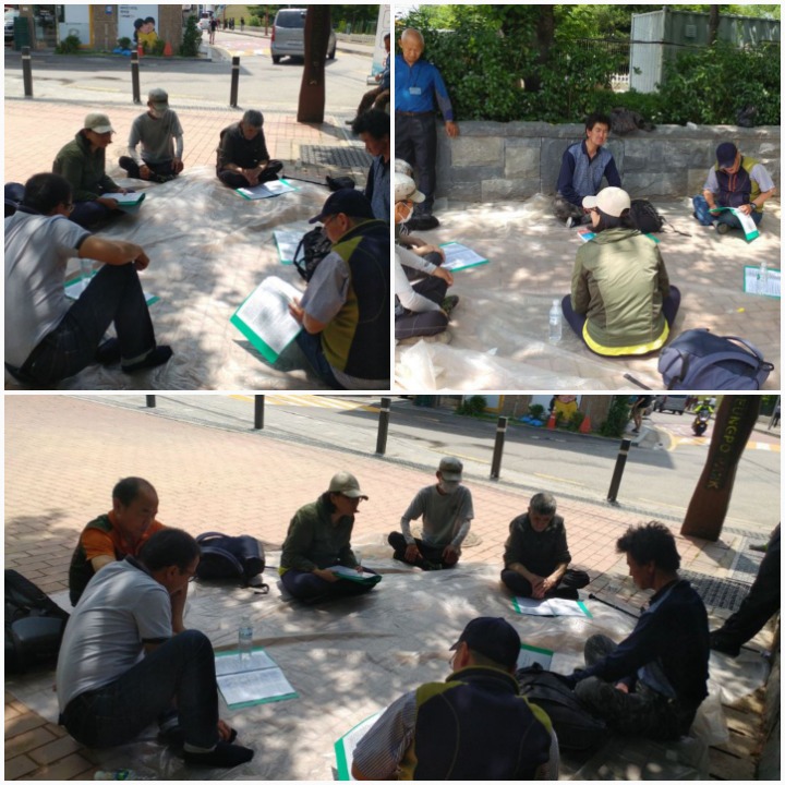 공원 입구에서 용달집사님이 사용하시는 비니루를 바닥에 깔고 우리 주님을 찬양했습니다