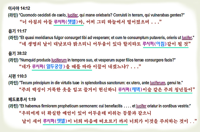 이 후 KJV1611이 이 불가타역의 <루치페르>를 영어식 <루시퍼>로 음역하여 옮겨온 것입니다.