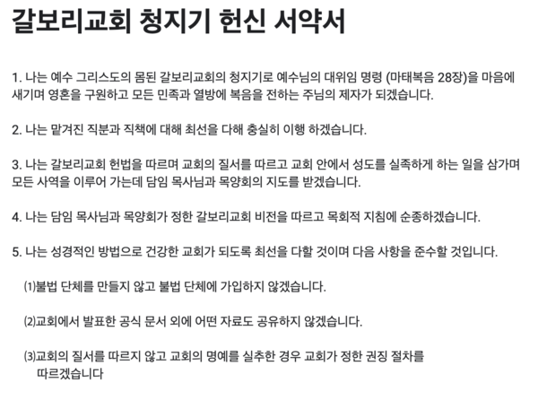 분당 갑보리교회 홈페이지에 올라와 있는 청지기 헌신 서약서(사진:갈보리교회 홈페이지)
