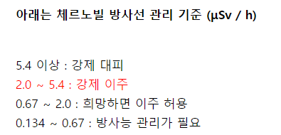 방사능 5.4미리시버트 이상이면 강제 대피지역입니다.