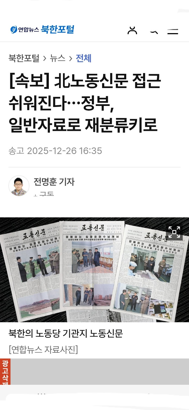 정부는 26일 국가정보원, 통일부 등 유관 부처가 참여한 가운데 '특수자료 감독부처 협의체'를 개최하고 기존 '특수자료'로 분류되던 노동신문을 '일반자료'로 재분류하는 안건에 대해 부처 간 공감대를 확인했다고 밝혔다.