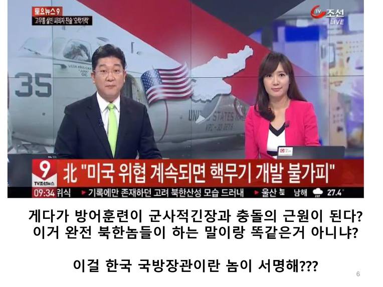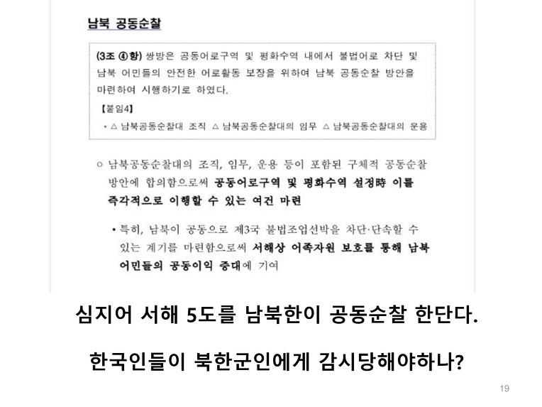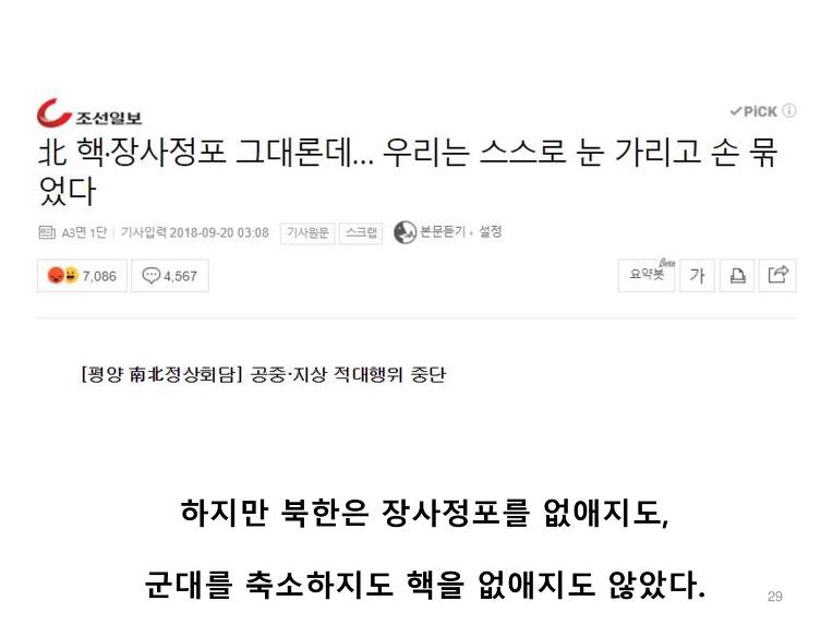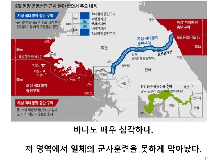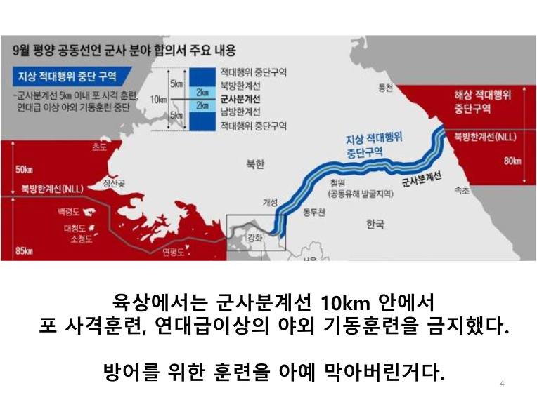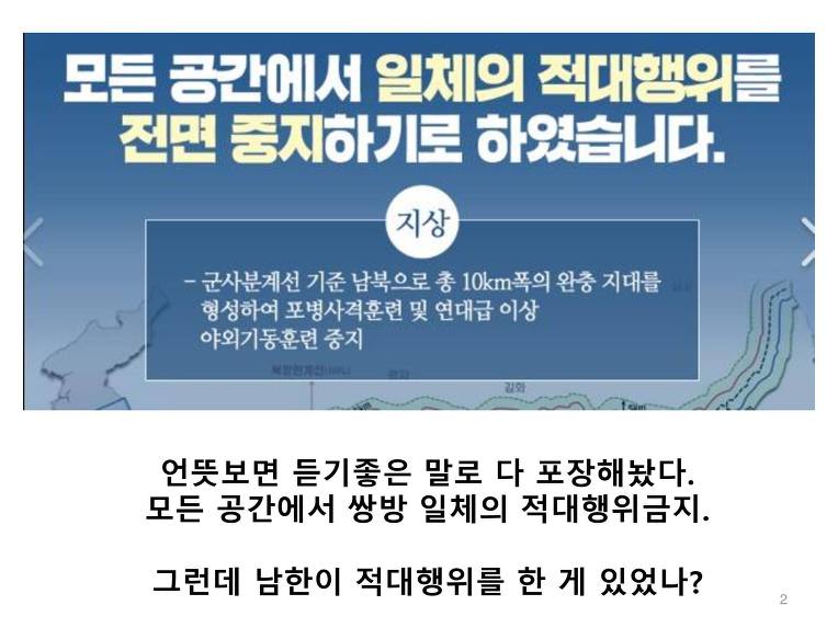육해공 일체의 적대적 행위 금지? 누가 적대적 행위를 했는가? 우리가? 설마 한미연합훈련을 적대행위라고 하는건가? 북한이 핵개발을 옹호하는 논리에 왜 가장 큰 피해자인 한국이 여기에 동조하는가?