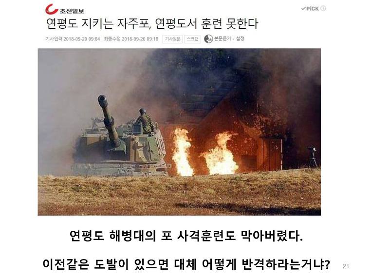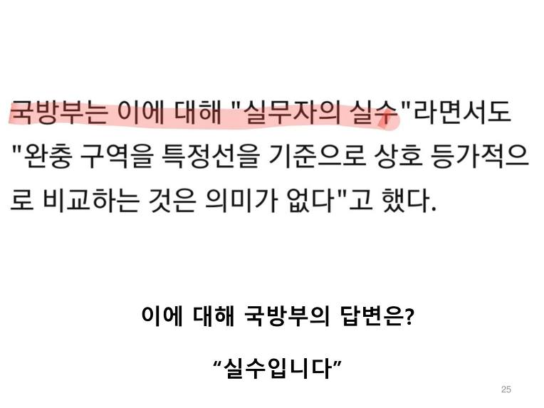 이에 대해 국방부는 "단순 실수"라고 답했다. 미친건가? 6.25 당시 한치의 땅을 더 얻기 위해서 산화한 순국선열들을 능욕하는 것인가? 이와 반대로 북한은 핵을 없애지도, 장사정포를 없애지도, 군축을 하지도 않았다. 하지만 문재인은 "민족자주평화"라는 망상 아래 북한의 요구를 들어주고 굴욕적인 항복문서, 영토 상납문서에 서명했다.