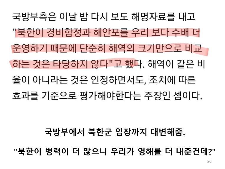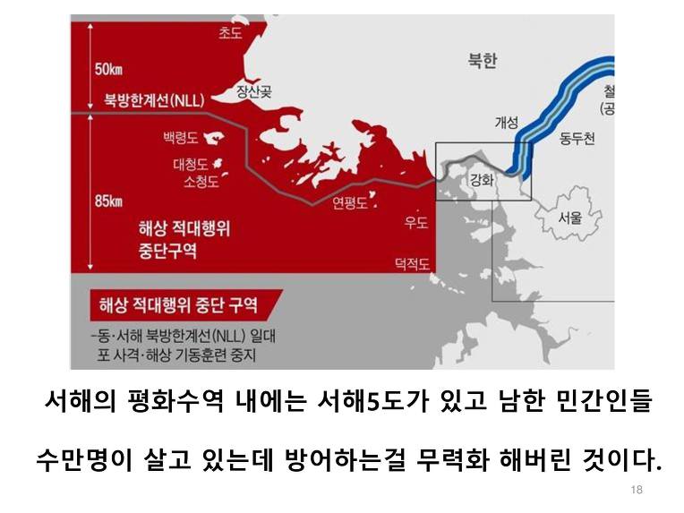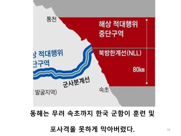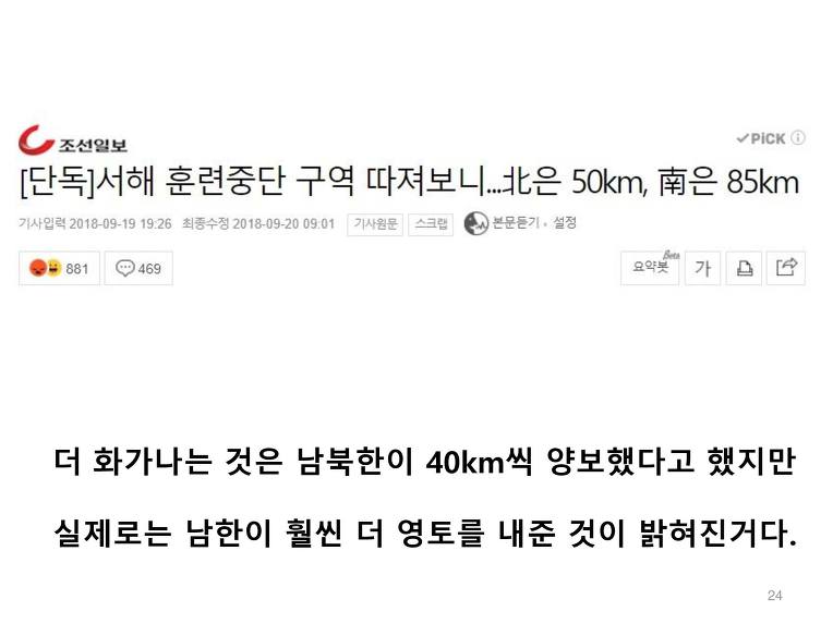 더욱 화가 나는 것은 국방부에서 최초에는 서해안을 남북이 똑같이 40km씩 양보한다고 발표했었다. 하지만 이것은 거짓이었다. 한국이 훨씬 많이 양보, 아니 북한에 상납하게 되었다.