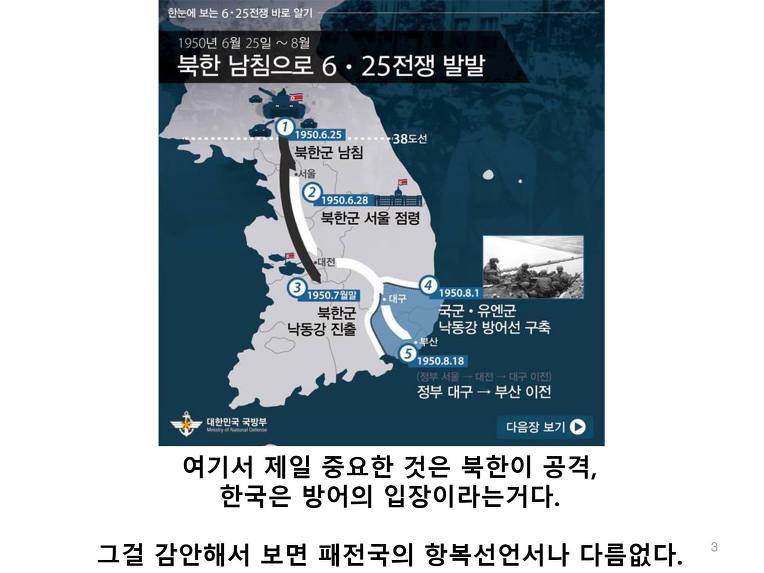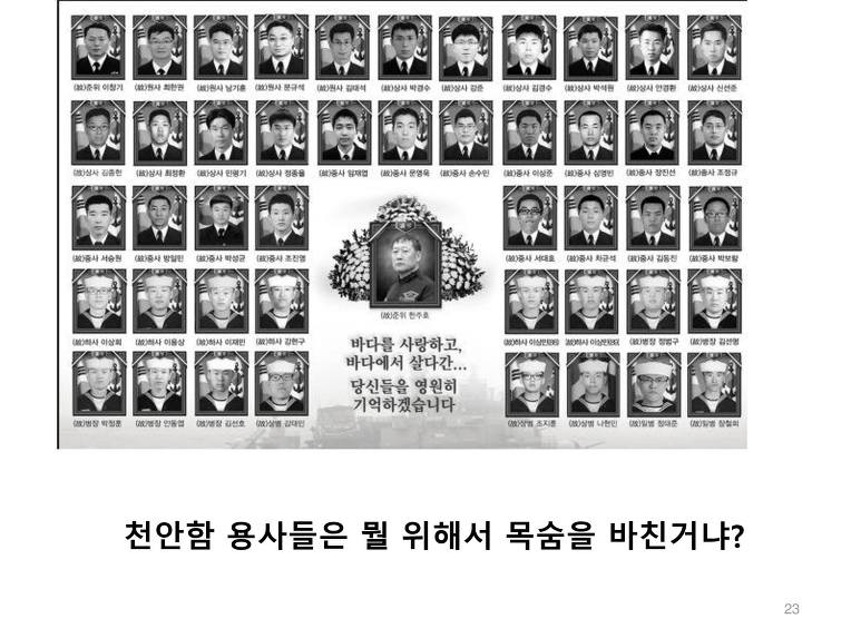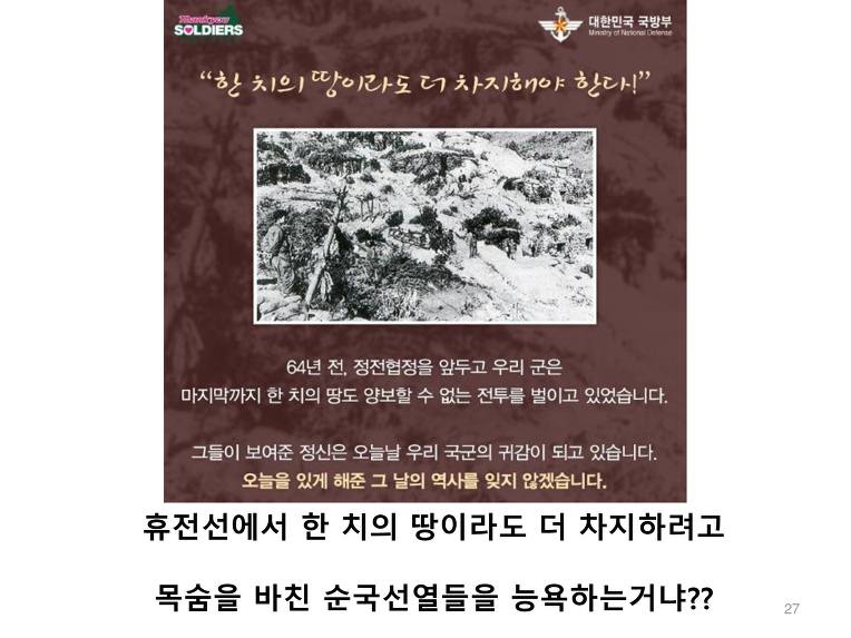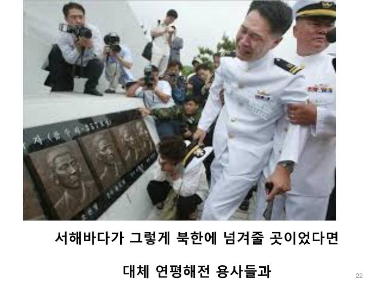 대체 그렇다면 윤영하 소령 외 5명의 연평해전의 용사들과, 천암함 46용사와 한주호 준위는 왜 죽 것인가? 이렇게 쉽게 영토를 상납할거면 왜 그들이 피를 흘리면서 그 바다를 지켰냔 말이다!!!!!!!!!!!!!!!