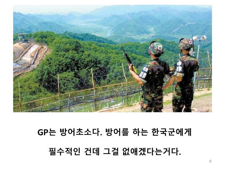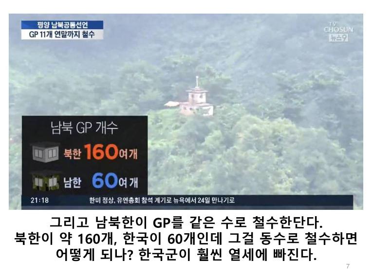 육지에서는 남북 10km 안에서 기동훈련도 포사격도 금지되었다. 한국은 휴전선 아래쪽은 전부 민가라서 다른 곳으로 옮겨서 훈련을 할 수도 없다. 그리고 GP도 "같은 수"로 철수한다고 한다. GP는 실제로 북한이 훨씬 많은데 같은 수로 철수하면 한국이 훨씬 불리하다. 게다가 GP는 수도권을 막고 있는 방어선인데 그걸 축소하겠다고? 휴전선 50km 아래가 서울인데?