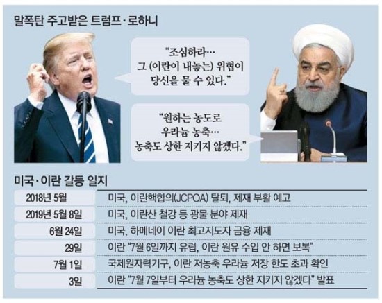 우라늄 농축도 상향은 핵무기 개발의 신호탄인 고농축 우라늄을 보유할 수 있는 조치로 핵합의 탈퇴를 본격화하겠다는 의미다. 앞서 이란은 미국의 핵합의 탈퇴 1년째인 지난 5월 8일 미국의 이란 제재에 대해 60일 안으로 핵합의 당사국인 유럽 3개국이 조치를 취하지 않으면 농축도를 상향하겠다고 예고한 바 있다. 이란은 영국·프랑스·독일이 이란산 원유 수입 재개 등 핵합의에서 약속한 경제적 이득을 취할 수 있도록 하라고 요구하고 있다. 이날도 로하니 대통령은 "유럽이 일정과 계획대로 핵합의 의무를 지키지 않는다면 아라크 중수로도 핵합의 이전 상태로 돌리겠다"고 압박했다.