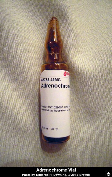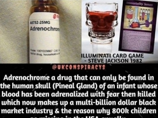 아드레날린의 산화로 형성되는 아드레노크롬은 마약성 향정신성물질의 원초적 생성물이라고 할 수 있는데 일루미나티들이 은밀히 여자와 아이들을 인신제사로 바친 후 그 피를 탐닉하는 이유 가운데 하나가 바로 이 아드레노크롬의 강력한 환각 작용을 경험하기 위한 것이라고 한다.