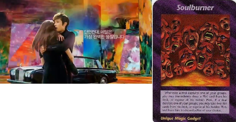 즉, 메탈이 폰을 감싸는 모습 및 이병헌이 여자를 끌어안는 모습은 대중들이 과학기술에 눈이 멀어 있는 동안에 자기도 모르는 사이에 일루미나티에 의해 저항할 수도 없이 속박될 것이라는 암시인 셈입니다.