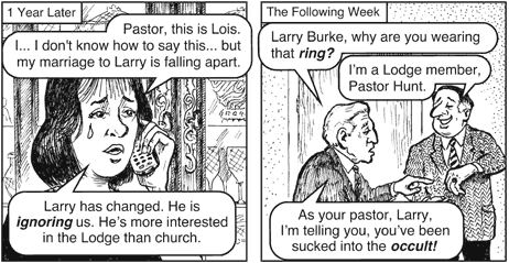헌트 목사 : "래리 집사님, 왜 당신은 그 메이슨 반지를 끼고 있습니까?"
