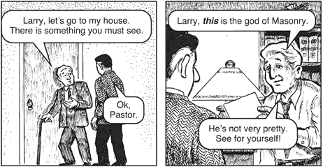 헌트 목사 : "래리, 이것이 메이슨의 신이요. 흉악하게 생겼소, 보세요!"