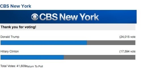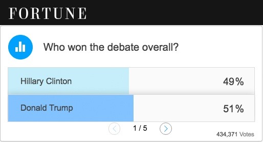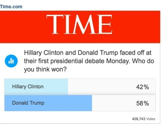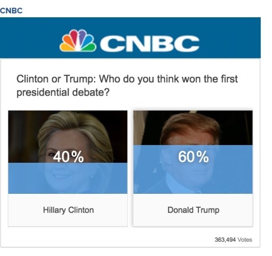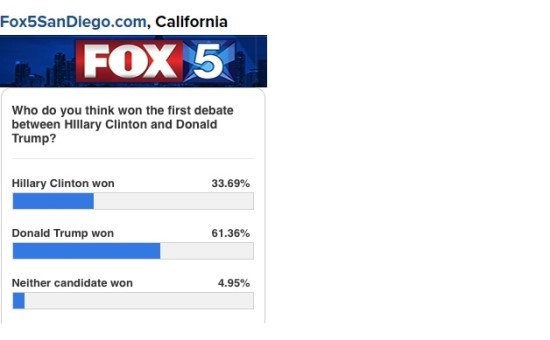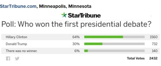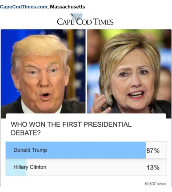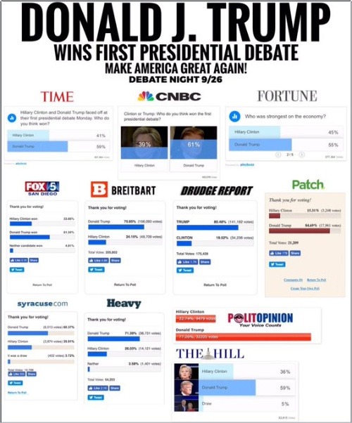 아래는 미국의 대안언론 Inforwas.com에서 공개한 대선 토론 직후에 있었던 각종 언론 매체들의 여론 조사 자료 결과 이다. 30여 개 이상의 언론 매체에서 실시한 여론 조사 가운데 힐러리가 토론에서 승리했다고 발표한 곳은 NBC News와 WCVB (Boston), AOL, Star Tribune 그리고 CNN/ORC polls 다섯 곳뿐이었다.