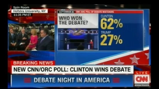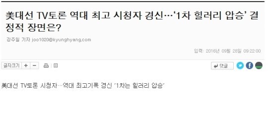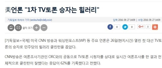 한국 언론에서는 힐러리의 홍보매체인 CNN의 여론 조사 결과를 가지고 힐러리가 1차 TV토론에서 압승을 했다는 보도를 내보냈다.
