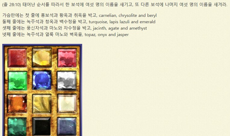 출28:17~21 그것에 네 줄로 보석을 물리되 첫 줄은 홍보석황옥 녹주옥이요