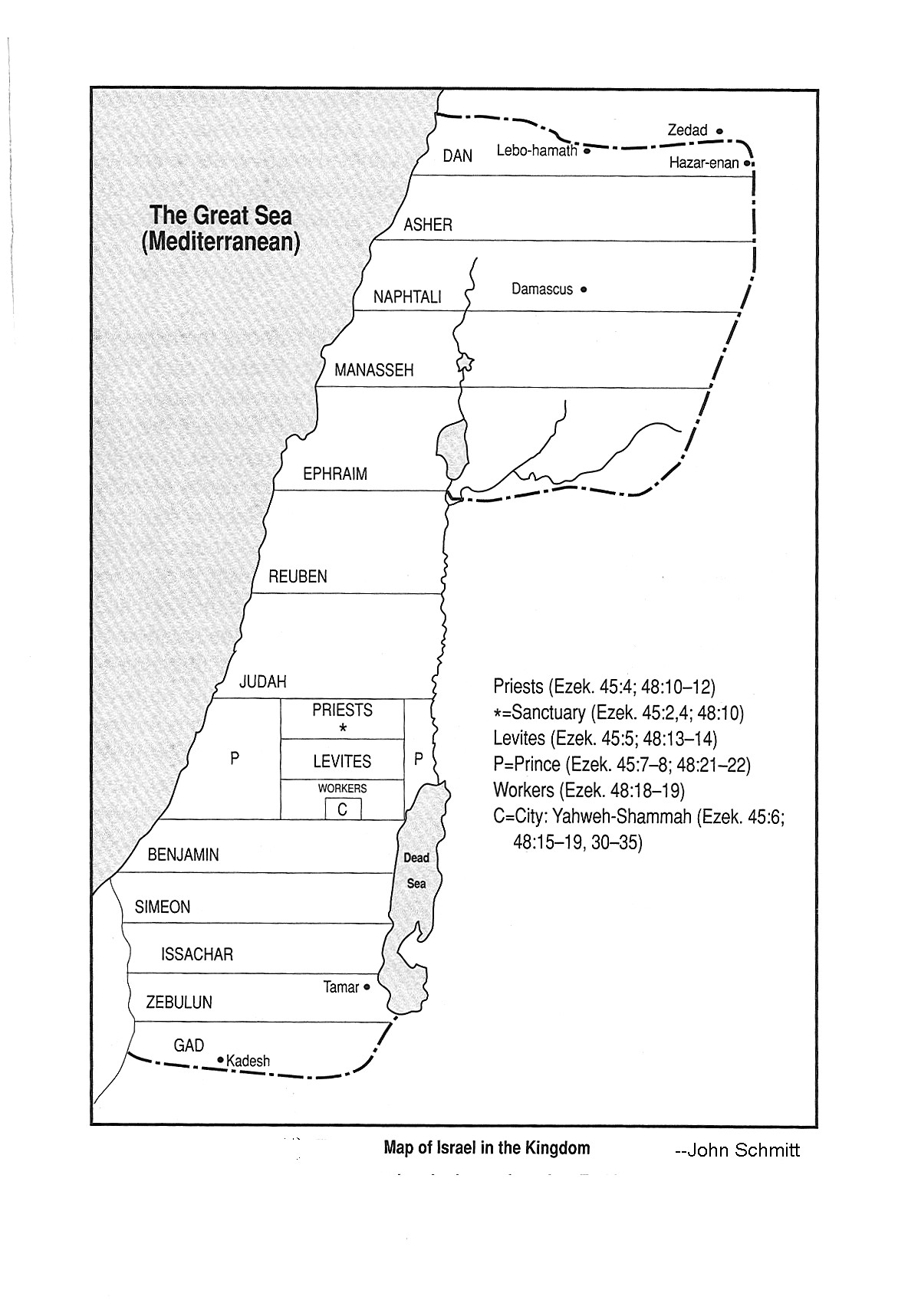 에스겔서 48:1절 "이제 지파들의 이름이 이러하니라. 북쪽 끝에서부터 헤들론 길의 지경까지,