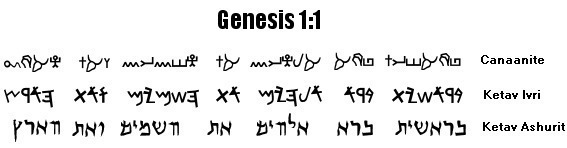 위쪽은 고대 카나안 문자(페니키아 문자와 사실상 같습니다), 중간은 기원전 6세기경의 히브리 문자. 아래쪽은 이후 아람어의 영향을 받은 정방형 히브리 문자입니다. 상형문자 모양이 점점 사라져가죠, 내용은 같습니다.