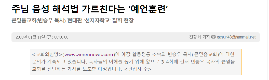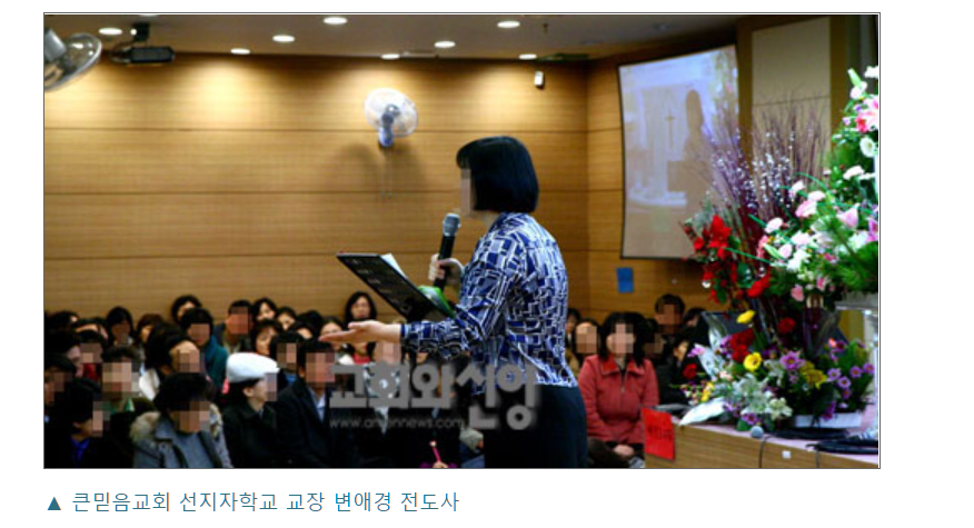 | 말 그대로 문전성시다. 900명이 훌쩍 넘어 보인다. 기자(교회와신앙 www.amennews.com)가 도착한 시간은 집회시간 30분전이었지만 이미 앉을 자리도 없다. 대부분 청년들과 젊은 부부를 중심으로 한 가족단위 신도들이 많았다. 1월 1일 오후 2시 서울 서초동 큰믿음교회(예장 합동정통, 변승우 목사)에서 운영하는 ‘선지자학교’ 집회시간이다. 선지자학교 교장이라는 변애경 전도사가 나와서 자리를 정돈시키며 “오늘은 신년정초이니만큼 ‘개인예언’ 받을 수 있는 시간을 최대한 많이 주겠다”고 약속했다. 그녀는 오늘이 1월 1일이니만큼 총 115명의 예언사역자라는 사람 중 72명이 동원돼 개인예언을 하게 될 것이라고 했다. “예언집회를 시작한 이래 이렇게 많은 예언사역자가 한꺼번에 동원되기는 이번이 처음”이라고도 했다. 참석자들은 자기들끼리도 너무 많은 참석인원에 서로 놀라는 눈치다. 이날 선지자학교는 변애경 전도사의 예언에 관한 전체강의 ▷공개예언 ▷개인예언 순으로 진행됐다. “예언은 끝나지 않았습니다. 오히려 더 빈번해질 것입니다. 예언을 멸시하지 마십시오. 예언은 중요합니다….” 강의에 앞서 상영된 예언자학교 홍보영상에는 '세계적인 예언가'라는 스티브 탐슨 목사의 예언이 자세히 소개됐다. 하나님이 그를 통해 큰믿음교회에 주었다는 예언이다. “다가올 날들에 주님이 바로 여기, 큰믿음교회에서 아주 중요한 일들을 해 나가실 것입니다. 예언적인 기름부으심뿐 아니라 꿈과 환상들을 해석해 낼 수 있는 기름부으심도 주어질 것입니다. 예언적인 전도가 일어나 수많은 영혼들을 구원하게 될 것입니다. 담임목사님들에게 사역함으로 그들이 격려를 받게 될 것입니다….” 홍보영상은 계속해서 선지자학교가 ‘직통계시훈련’ 즉, ‘예언훈련’을 통해 정확한 주님의 음성을 꿈과 환상으로 보고 해석하는 방법을 가르친다고 강조한다. 특히 “환상이 열려 예언사역자로 훈련받고 싶은 사람은 타 교회 교인들도 참석할 수 있으며, 훈련받은 후에 본 교회에 가서 충성하라”는 멘트가 눈길을 끌었다. 서울에선 매주 2차례, 울산과 부산에선 한 달에 한번 열린다는 자세한 안내도 곁들였다. 홍보물 상영이 끝나자 변애경 전도사의 예언에 관한 전체강의가 이어졌다. 그녀는 “확실하게 순종해야 하나님의 예언이 성취되는 것”이라며 “예언을 많이 받아도 불순종하면 공든 탑이 무너지는 것”이라고 했다. 예언의 성취 여부가 예언을 주신 하나님께 있지 않고 인간에게 있다는 것이다. 변 전도사는 창세기 12장 이하를 근거로 “아브라함이 이삭을 바치라는 시험에 합격했을 때 비로소 예언이 성취될 수밖에 없게 되었다”고 주장했다. “시험은 여러분이 가진 예언의 성취에 있어서 절대적으로 중요한 부분입니다. 많은 사람들이 이 부분에서 예언을 놓쳐버립니다. …하나님은 반드시 시험을 주십니다. 아브라함이 시험에 합격했을 때 하나님의 예언은 약속에서 맹세로 바뀝니다. 이제는 내 이름을 걸고 맹세하겠다. 이제는 하나님의 손으로 넘어간 것입니다. 이제는 조건적인 예언에서 절대적인 하나님의 권세로 넘어갔기 때문에 이 예언은 절대적으로 성취될 수밖에 없게 된 것입니다.” 변 전도사는 계속해서 “아브라함은 75세에 예언 처음 받았는데, 그렇다면 여러분은 앞으로 얼마나 더 많은 하나님의 예언들을 이루어가겠느냐”고 반문하며 “꾸준하게 계속 예언을 받으라”고 강조했다. 받은 예언들보다 아직 이루지 못한 예언이 더 많아도 포기하지 말라는 격려와 함께였다. 변 전도사의 주장은 한마디로 “항상 예언을 붙잡고 기도하면서 살라”는 것인데, 강의가 진행된 한 시간 내내 “성경말씀을 읽고 연구하며 1년 동안 열심히 순종하자”는 말은 단 한 번도 강조하지 않았다. 잠시 후, 선지자학교는 2부 공개예언으로 이어졌다. 엄숙하고 권위 있는 분위기일 것이라는 예상은 완전히 빗나갔다. 변 전도사는 “오늘은 정초니까 여기까지만 말씀 전하겠다”며 전체강의를 끝내더니 “공개예언 안하면 심심하니까 공개예언 좀 하다가, 개인예언 받을 수 있는 시간을 충분히 드리겠다”고 말했다. 변 전도사는 또 앞으로 불러낸 ‘선지자들’에게 “공개예언을 시작하라”며 “물 좋은 데로 가지 말고 골고루 흩어져서 예언하라”고 농을 했다. 변 전도사에 의해 뽑힌 약 10여명의 ‘선지자들’이 회중들 사이를 오가며 순서대로 ‘예언’을 진행했다. 선지자의 2/3는 젊은 여자신도들이었는데, 그들은 회중들 사이를 오가다가 손가락으로 특정 사람을 가리키며 ‘예언’을 행하는 방식을 취했다. “성도님에게서 하나님을 향한 강한 열망이 뿜어져 나오는 것이 보입니다”, “성도님께서 하나님의 성품들에 대해서 더 많이 깨닫게 되는 것을 보여주십니다” 등과 같은 내용이다. ‘선지자들’의 말은 굉장히 빨랐으며, 잠시 숨 돌릴 틈도 없이 다음 ‘선지자’가 계속 바통을 이어받아 ‘예언’을 실시했다. 이렇게 약 30분간 10여 명의 신도들에게 공개예언이 진행된 후, 드디어 3부 개인예언 시간이 됐다. 2인 1조의 ‘예언팀’ 72명(36개 팀)이 약 3시간동안 참석한 신도들