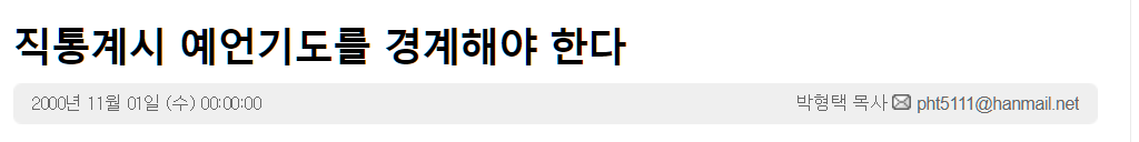 박형택 목사(예장합신 이단사이비대책위원) 며칠 전 이상한 편지 한 통을 받았다. 편지 내용의 대략을 보면 다음과 같다. “그 분(차재복 장로 80세)은 복음으로 통일이 되게 하겠다는 하나님의 약속을 받고 1.4후퇴 때 월남하셔서 지난 50년 동안 한결같이 약속을 바라고 일해 오신 분으로서 통일을 뒷받침하고 예수님의 도를 벗어난 기독교를 되돌리고 하나로 묶을 만한 충분한 말씀이 있습니다. 그 동안 하나님께서 약속의 증거를 여러 번 보이셨고 (중략), 새 천년을 맞으면서 하나님의 약속을 바라는 저희들이 더욱 간절한 마음이 되어 애타하던 중 2000년 2월 28일이었습니다. 오는 6월 15일에 대한민국에 어떤 큰 일이 있을 것이라는 계시를 받고 어떤 일인지 궁금해 하던 차에 4월 10일에 정부에서 남북정상회담이 열린다는 발표가 되어 놀랍기 그지없었습니다. 이제 하나님의 큰 일이 확산될 수밖에 없는 시점에서 같이 일할 사명자를 찾습니다.“ 강북구에 서울교회의 장로, 권사, 전도사, 교인 등 몇 사람이 예언을 하며 계시를 받았다는 한 장로를 따르면서 그 장로에게 임한 하나님의 약속 곧 대한민국이 복음으로 통일된다는 사실을 증거하지 않으면 수치를 당하리라는 하나님의 경고를 받고서 용기를 내어 사명을 감당해야 할 장로를 소개하는 편지를 띄우게 되었다는 내용이다. 도대체 왜 이러한 편지를 교회들에게 보냈을까? 생각하면서 그곳에 전화를 하였다. 좀더 소상히 알고자 하였기 때문이다. 전화를 받은 권사의 말을 요약하면 이렇다. 차재복 장로라는 사람이 1.4후퇴 때 월남하였는데 복음으로 통일이 되게 하신다는 하나님의 약속을 받았다고 한다. 그런데 어떤 목사님을 모시고 교회를 세워 은혜롭게 성장해 갔는데(서울교회), 목사에게 사기를 당했다고 한다. 그래서 지금은 장로 둘 권사 및 전도사 수명의 교인이 집에서 예배를 드리는데 최근 차재복 장로에게 하나님의 계시가 임했다(2000년 2월 28일). 그것은 2000년 6월15일에 어떤 큰 일이 있으리라는 계시였다고 한다. 말씀은 누가복음 17:20~21의 말씀이었다고 한다. “바리새인들이 하나님의 나라가 어느 때에 임하나이까 묻거늘 예수께서 대답하여 가라사대 하나님의 나라는 볼 수 있게 임하는 것이 아니요 또 여기 있다 저기 있다고도 못하리니 하나님의 나라는 너희 안에 있느니라“ 왜 하나님께서 이러한 말씀을 주시는지 궁금해하던 중 4월 10일이 되어서야 정부발표를 보고 한국이 복음으로 통일이 될 것이라는 하나님의 계시인줄 알았다고 한다. 사람은 정치적인 통일을 원하지만 이 나라는 하나님의 섭리 안에 있기 때문에 정치적으로 통일이 되는 것이 아니라 복음으로 통일이 된다는 것이다. 정상회담 이후 정치가들에게 거는 기대의 비중이 커진 것은 사실이지만 정부는 북한에게 끌려 다니고 있는데 그것은 하나님이 어떤 일을 하시리라는 증거라고 한다. 앞으로 남한에는 큰 혼란이 가중될 것이지만, 복음 평화통일은 하나님의 절대적인 뜻이기 때문에 대한민국 교회들의 미스바 운동을 통해 짧은 시기에 반드시 이루어질 것이라고 한다. 특히 차재복 장로라는 사람은 성경의 난제를 기도해서 풀어주는 은사가 있고 한국교회를 하나로 묶을 만한 말씀이 있다는 것이다. 편지를 보낸 후에 격려편지도 있고 질타하는 편지도 있는데 어떤 총회신학교에서는 차재복 장로를 모셔다가 집회를 하고 간증을 하기도 한다는 것이다. 필자에게 수집된 자료에 보면 하나님께 계시를 받았다는 사람들의 서신이 상당히 많고 자신들의 예언이 맞았다고 그 기록을 공개한 수많은 목회자들의 기록이 있다. 그 중에는 목사도 있고 평신도도 있고 신부도 있고 수녀도 있다. 그중에 ‘대한예수교장로회 총회장(합동보수) 조돈기 목사‘라는 사람은 1930.6.26생으로 강원도 양구군 동면 팔량리 대암산 바람골에서 출생했다고 하면서 입산수도 38년간 파란만장 만수풍산 속에 은혜체험을 하고 예수님이 천하를 통일하실 때 자신의 사명은 하나님의 전권대사로서 지구 세계연방제국 황제폐하가 되어 예수 우주 연방제국 천황폐하되신 예수님을 모시는 것이라고 한다. 그래서 여기 저기 교회마다 자신의 사명을 알리는 글을 보내고 있다. 또 채후복(1947.10.15생/경북 김천시 평화동 245-32) 이라는 여인은 성당에서는 채지영이라고 하며 세례명은 베네딕다인데 하나님이 자기에게 새 이름을 주었다고 한다. 그 이름은 ‘특별한 모후 마리아‘라 한다. 그런데 1985년 3월부터 하나님의 음성을 듣게 되었고 자신에 관하여는 이태리 사람 곱비 신부가 한국에서 일어나게 될 일에 대하여 계시를 받아 기록한 책이 ‘성모님께서 가장 사랑하시는 당신의 사제들에게‘ 인데 이 글에 전부 기록되어 있다는 것이다. 참으로 황당하고 기가 막히는 일인데 본인들은 이것을 사실로 믿고 있다는 것이다. 이것이 어찌 사람의 생각으로 되겠는가? 거짓된 영의 역사임이 분명하다. 하나님께서 이스라엘 백성을 가나안으로 인도하실 때 특별하게 경계하신 말씀이 있다. 신명기 18장 9절~14절을 보자. “네 하나님 여호와께서 네게 주시는 땅에 들어가거든 너는 그 민족들의 가증한 행위를 본받지 