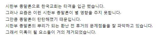 세상 나라가 종말을 고하는 것이 시한부 종말론이거든요.