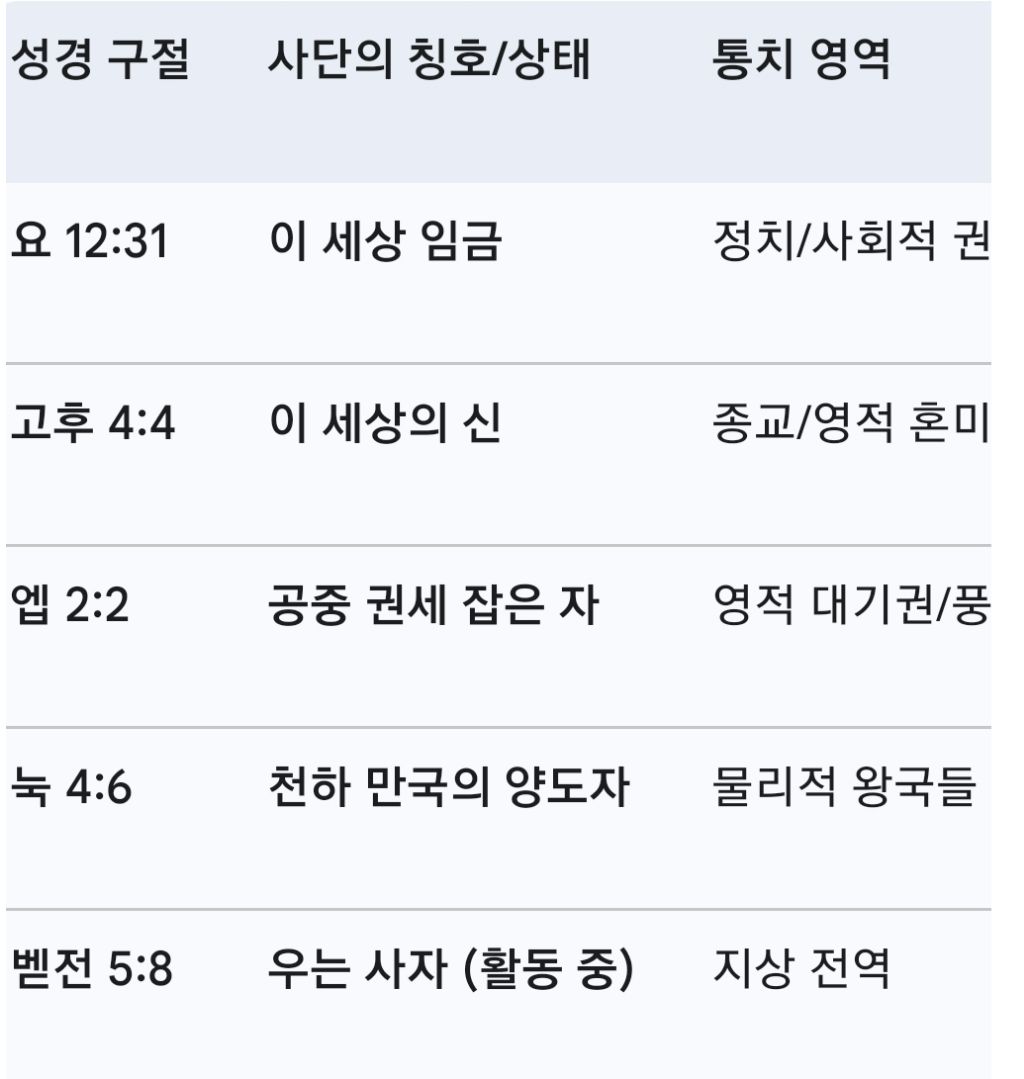 성경은 사단이 결박되어 힘을 못 쓰는 상태가 아니라, 오히려 **‘이 세상의 임금’**이자 **‘공중의 권세 잡은 자’**로서 실질적으로 활동하고 있음을 도처에서 증언하고 있습니다.