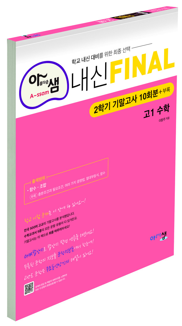- 2학기 기말고사 10회분과 부록에 수록된 모든 문항에 대하여 내용영역, 난이도 등의 정보를 제공하였습니다. 또한 어려운 문항에는 동영상 강의를 제공하였고 이를 표시하였습니다. 동영상 강의는 문제와 해설의 QR코드로 접속하실 수 있습니다.