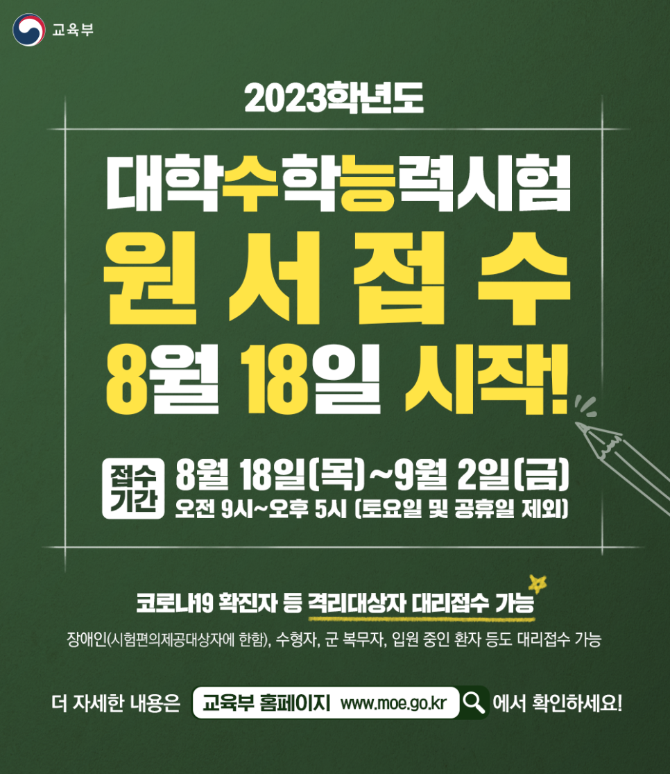 [교육부] 올해 수능 원서 접수, 8월 18일(목)부터 시작 작성자수학짱|작성시간22.08.19|조회수14 목록 댓글 0 글자크기 작게가 글자크기 크게가 [교육부 08-17(수) 조간보도자료] 올해 수능 원서 접수, 8월 18일(목)부터 시작.hwp1.86MB 첨부파일첨부된 파일이 2개 있습니다. png 파일 KakaoTalk_20220816_150616320.png 다운로드 hwp 파일 [교육부 08-17(수) 조간보도자료] 올해 수능 원서 접수, 8월 18일(목)부터 시작.hwp 다운로드 다음검색 현재 게시글 추가 기능 열기 북마크 공유하기 신고 센터로 신고 댓글 댓글 0 댓글쓰기 답글쓰기 댓글 리스트