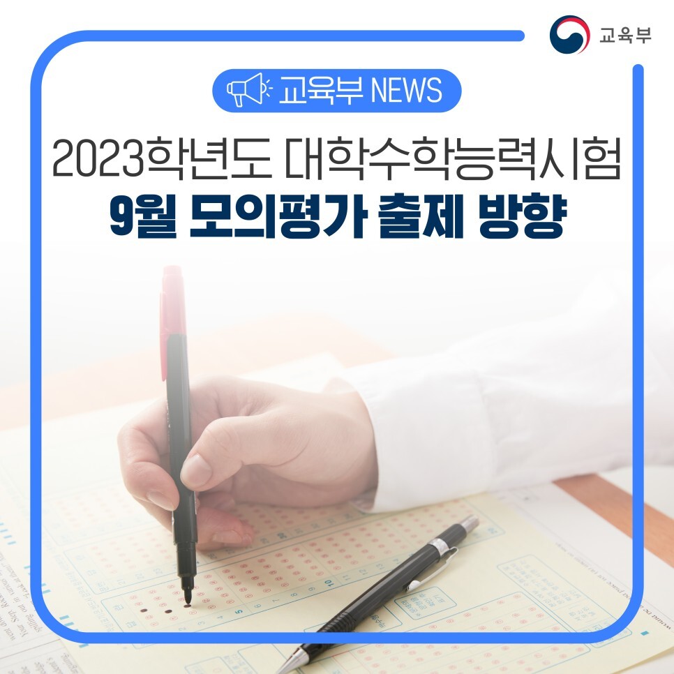[교육부] 2023학년도 대학수학능력시험 9월 모의평가 출제 방향 작성자수학짱|작성시간22.08.31|조회수38 목록 댓글 0 글자크기 작게가 글자크기 크게가 [교육부 08-31(수) 즉시보도자료] 2023학년도 대학수학능력시험 9월 모의평가 출제 방향.pdf156.34KB [교육부 08-31(수) 보도참고자료] 2023학년도 대학수학능력시험 9월 모의평가 출제 방향(2교시 수학영역).pdf208.37KB 첨부파일첨부된 파일이 3개 있습니다. jpg 파일 보도뉴스_0831_본문.jpg 다운로드 pdf 파일 [교육부 08-31(수) 즉시보도자료] 2023학년도 대학수학능력시험 9월 모의평가 출제 방향.pdf 다운로드 pdf 파일 [교육부 08-31(수) 보도참고자료] 2023학년도 대학수학능력시험 9월 모의평가 출제 방향(2교시 수학영역).pdf 다운로드 다음검색 현재 게시글 추가 기능 열기 북마크 공유하기 신고 센터로 신고 댓글 댓글 0 댓글쓰기 답글쓰기 댓글 리스트