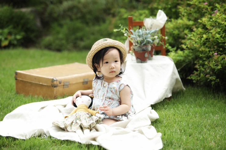 잔디밭 레이스소재위에 앉아있는 아이사진인데
