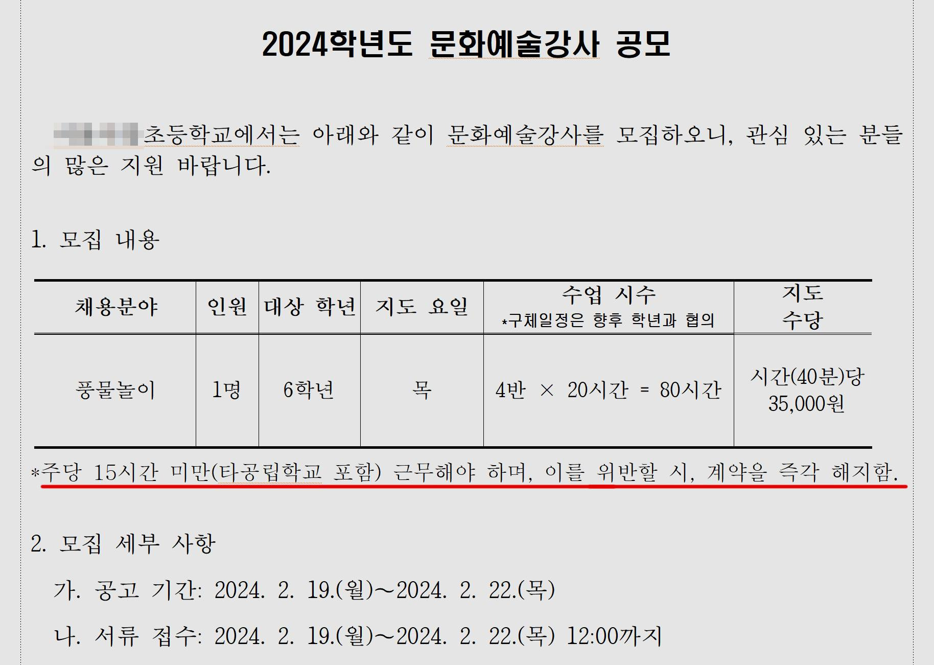 수익자부담으로 하는 방과후학교가 외에도, 무상으로 하는 늘봄학교, 그밖에 각종 지원금으로 운영하는 다른 무상 교육 역시 강사들이 많습니다. 교과시간에 하는 것도 있고 방과후에 하는 것도 있습니다. 그런데 이런 강사를 모집하는 공고를 보면 종종 "타학교 포함 주당 15시간 미만 근무"라는 한 줄이 있습니다.