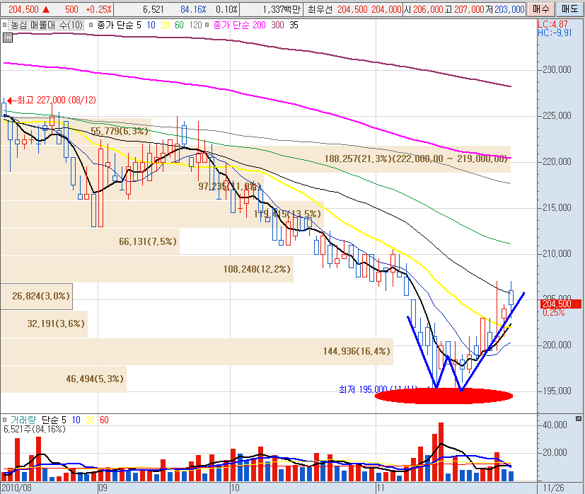 상승으로 전환 가능성이 높은 농심은 215,000원까지 무조건 홀딩합니다