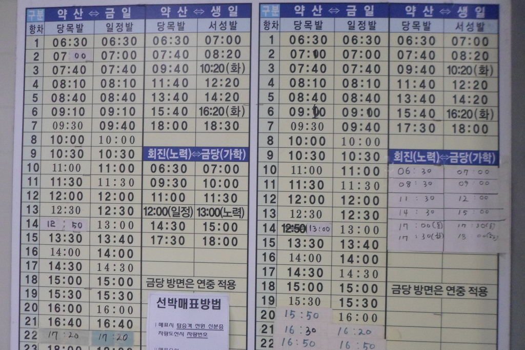 아래그림/[당목항/선착장]시간표 이다.*右측시간표는 10월1일부터3월31일까지 동절기 운행표 이다.