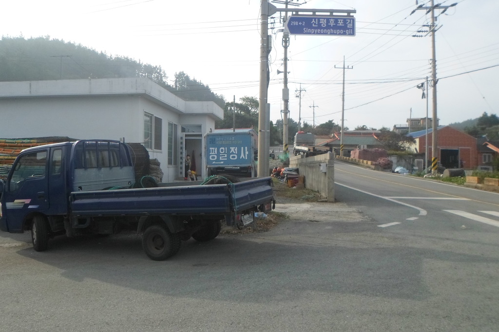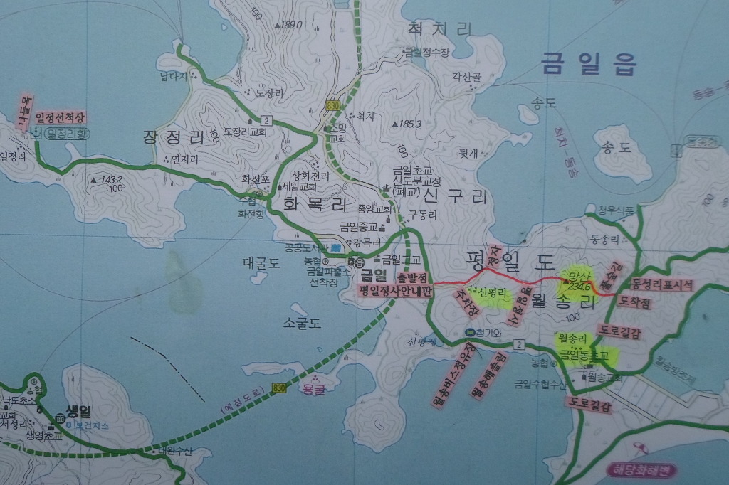 아래그림/[금일읍]지나 도로 左로 있는 [평일정사]안내판이다.내리자 마자 左측 시멘트마을길로 [신평리]주차장을 지나 약800m