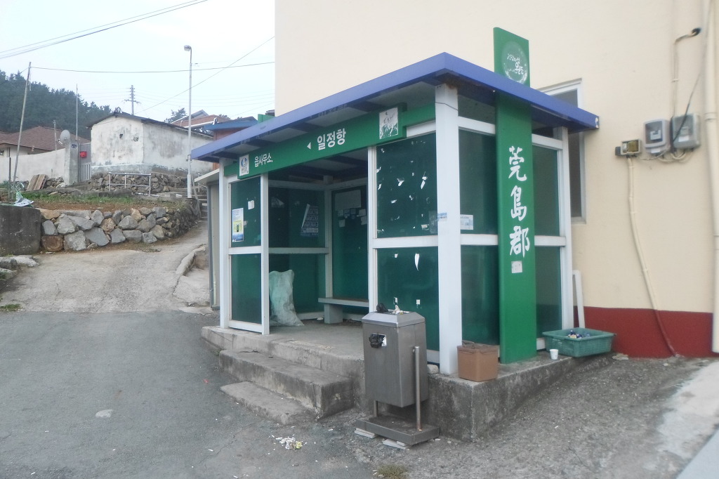 아래그림/[당목항]의 부두마트가 버스정유장을 겸하고 있다.버스시간표는 간판 아래쪽에 있는 전화번호를 이용 바람.
