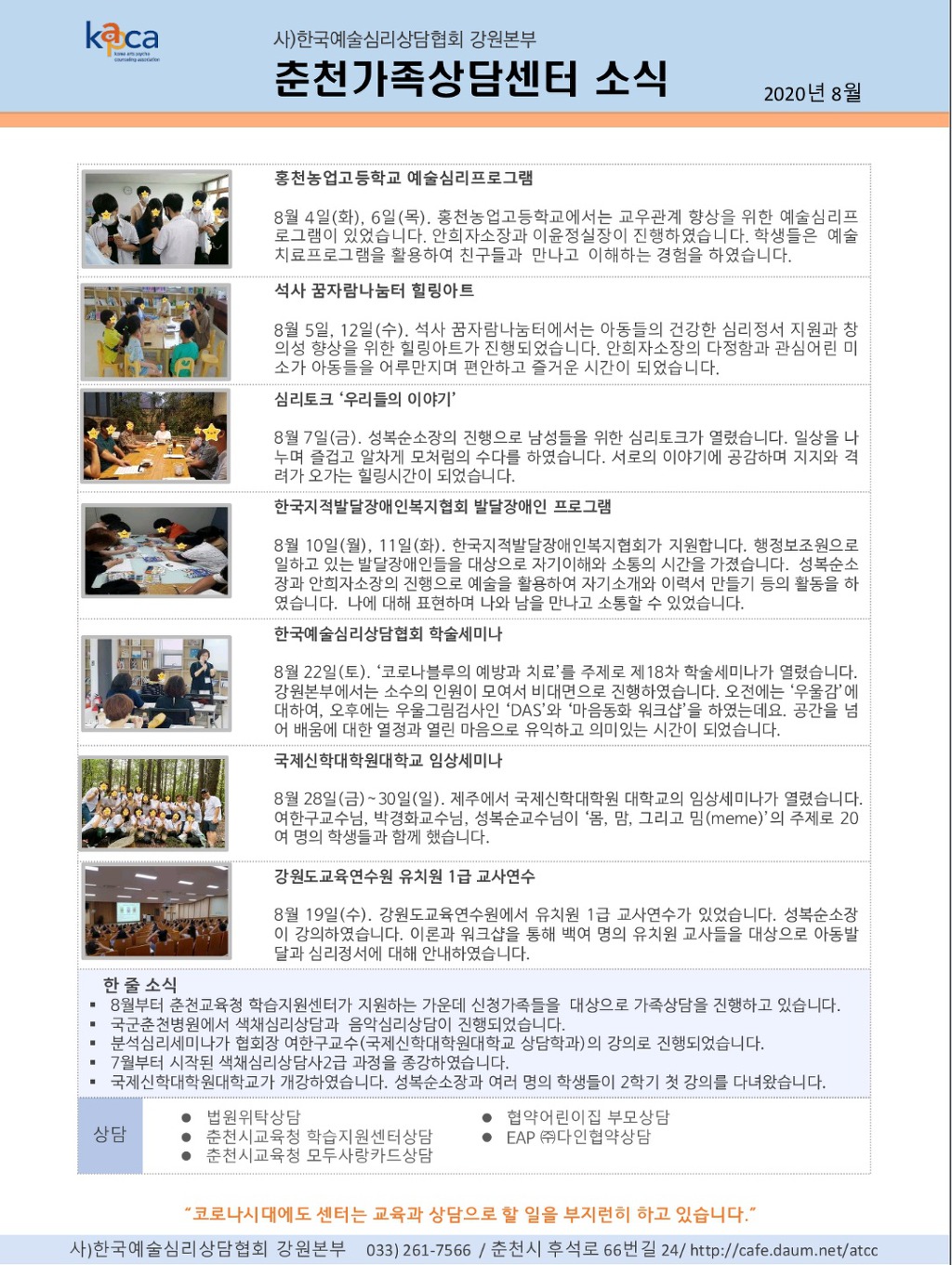 춘천가족상담센터 8월의 소식입니다. 작성자엘선|작성시간20.09.07|조회수172 목록 댓글 0 글자크기 작게가 글자크기 크게가 다음검색 현재 게시글 추가 기능 열기 북마크 공유하기 신고 센터로 신고 댓글 댓글 0 댓글쓰기 답글쓰기 댓글 리스트