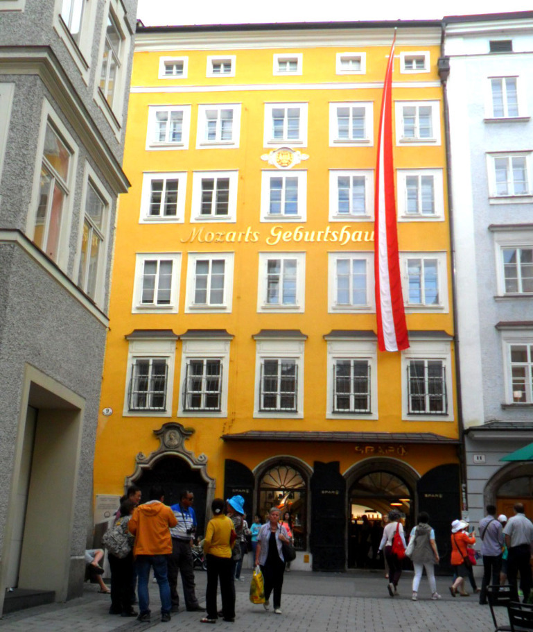 아버지 레오폴트 모차르트는 당시 잘츠부르크 궁정 관현악단의 음악감독으로 세 살 때부터 건반을 다루고 연주하는 법을 터득한 모차르트에게 직접 피아노와 바이올린을 가르치기 시작했다고 전해진다. 노란색으로 칠해진 6층 건물이 그의 생가로 건물 중간에 모차르트 생가(Mozarts Gebursthaus)라고 씌어있다. 언제나 방문객들이 북적대니, 지나칠 수가 없다.