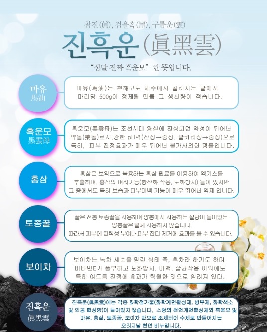 흑운모,은운모 미네랄과 홍삼, 토종꿀, 보이차 ,마유를 주성분으로 수제로 만들고있으며.