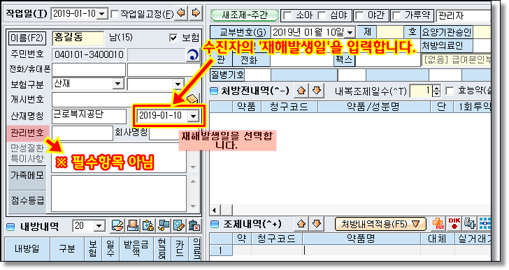 ③-4 처방전 발행기관정보에 산재승인번호를 입력합니다.