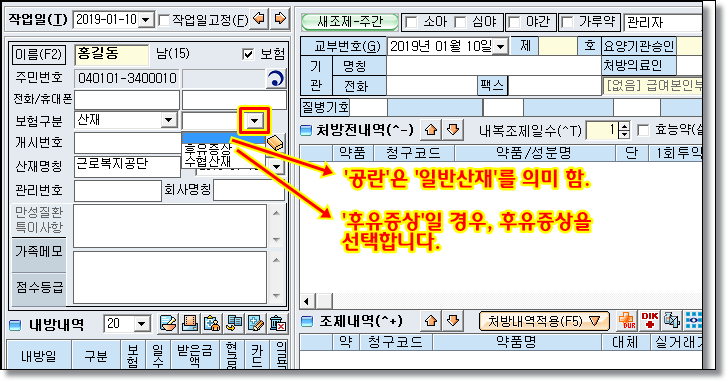 ③-1 산재환자 입력후 보험구분을 '산재'로 선택합니다.